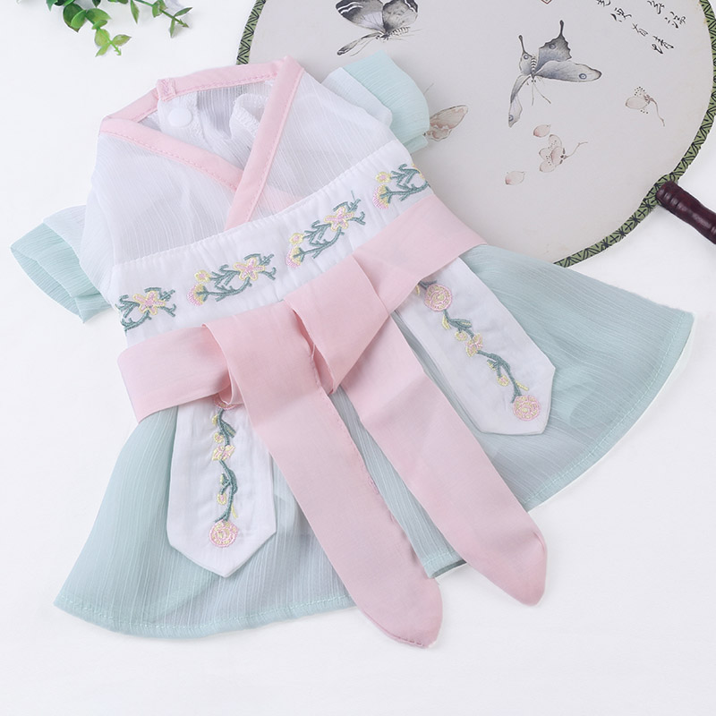 精巧な花柄刺繍が施された本格的な祭り用着物風の犬服です。