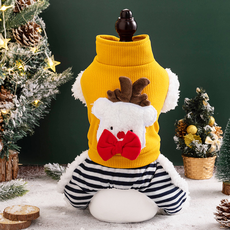 愛らしいトナカイの立体装飾が背中に施された冬の定番犬服です。 ふわふわのもこもこ素材で作られた顔に、赤いりぼんがアクセントとして華やかさを添えています。 上半身は柔らかなコーデュロイ素材、下半身はボーダー柄で切り替えたおしゃれなつなぎデザインです。 保温性に優れた素材で寒い季節も快適に過ごせます。 冬のお散歩や季節のイベントにぴったりの一着で、大切な愛犬を可愛く暖かく包み込みます。