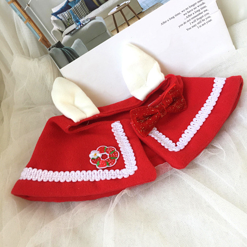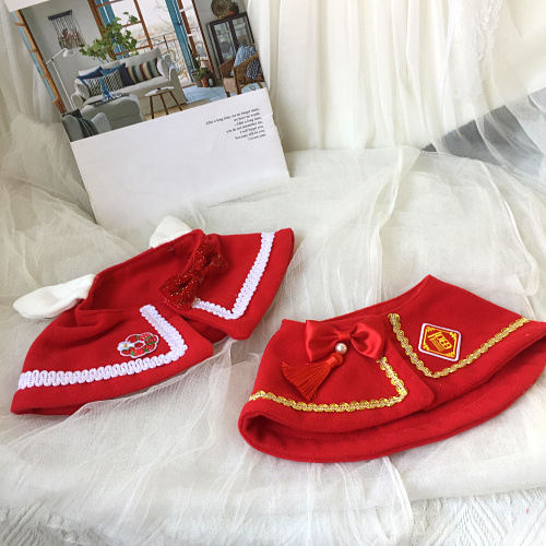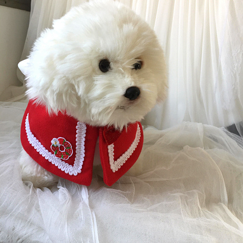 愛犬をおしゃれに変身させるセーラーカラーのマント型犬服です。 首元にリボンがあしらわれ、襟部分には可愛らしい波型のトリミングが施されています。 ケープタイプのアウターなので、着脱も簡単で普段使いからお出かけまで幅広く活躍します。 ワンポイントの刺繍がアクセントとなり、特別な日のお洋服としてもぴったりです。 軽やかな着心地で動きやすく、愛犬の可愛らしさを引き立てます。
