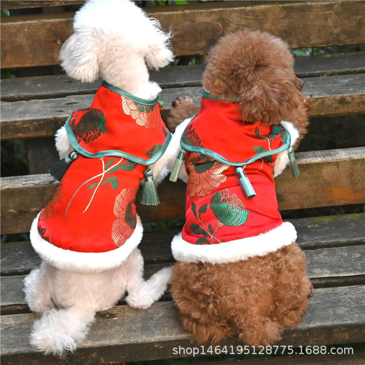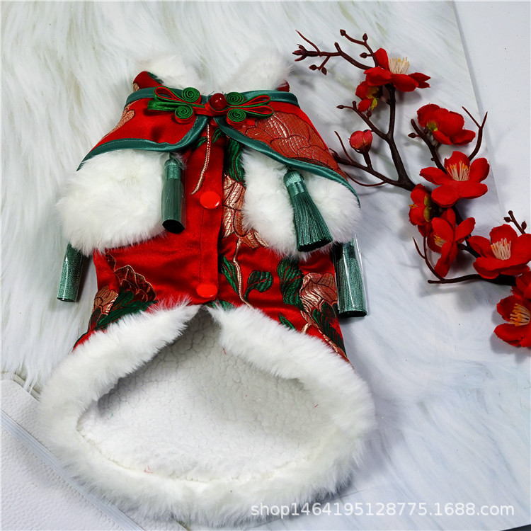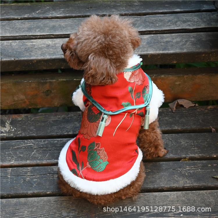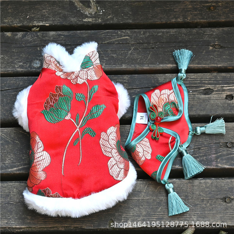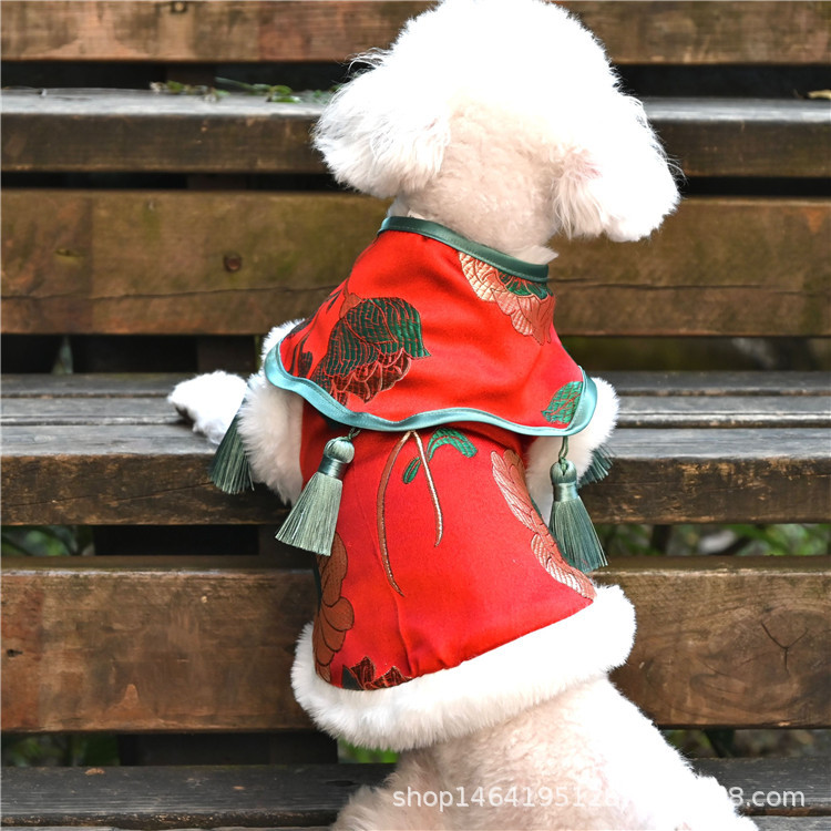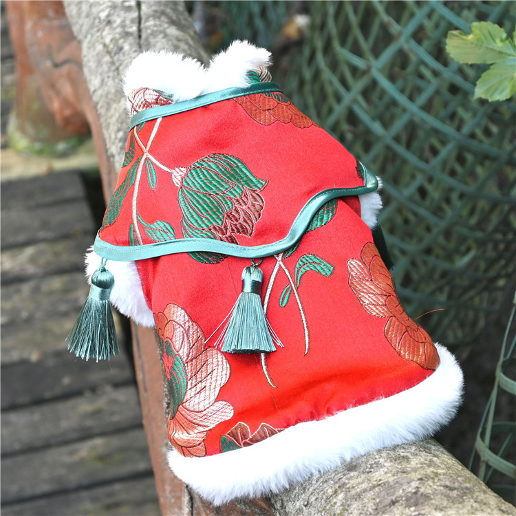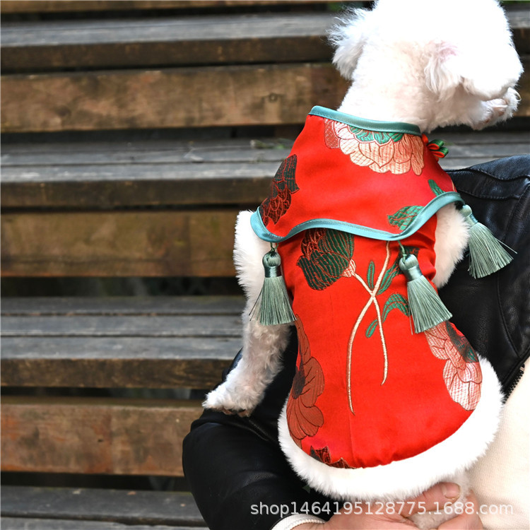 伝統的な花柄刺繍が美しい犬服のワンピースです。 華やかな刺繍の花模様と優雅な房飾りが愛犬を上品に彩ります。 襟元と裾にあしらわれたふわふわのファーが高級感を演出し、特別な日のお出かけにぴったりです。 中華風のデザインが個性的で、お正月や記念日などの晴れの日に最適なワンピースとなっております。 背中のボタンで着脱も簡単です。