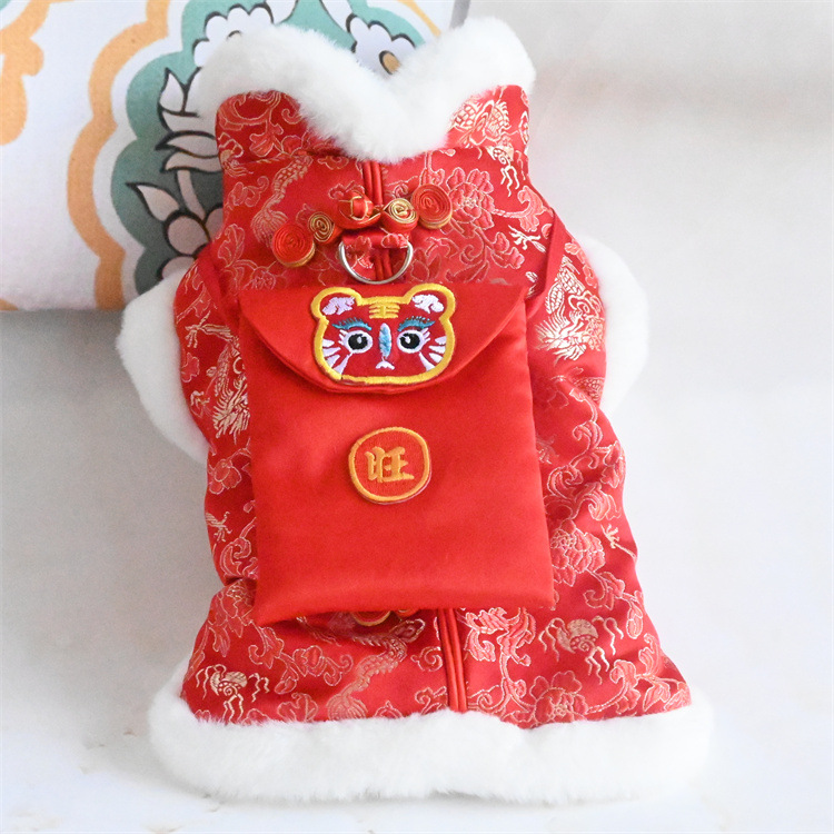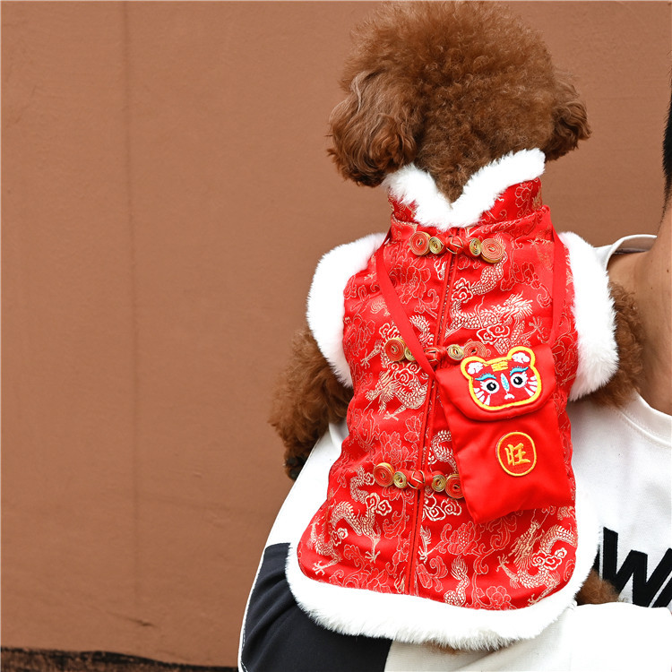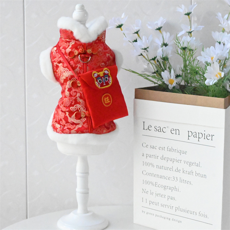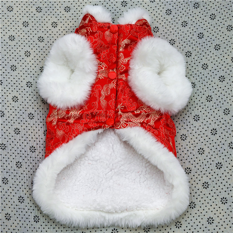 伝統的な龍の刺繍が施された豪華な犬服のワンピースです。 襟元と裾にふわふわのファーを贅沢にあしらい、高級感と暖かさを両立しました。 背中には可愛らしい獅子舞のワンポイント飾りと金ボタンがアクセントになっています。 新年やお祝いの席にぴったりの華やかなデザインで、愛犬を特別な存在に演出します。 チャイナ風の縁起の良い柄が、お出かけや記念撮影を一層盛り上げてくれる一着です。