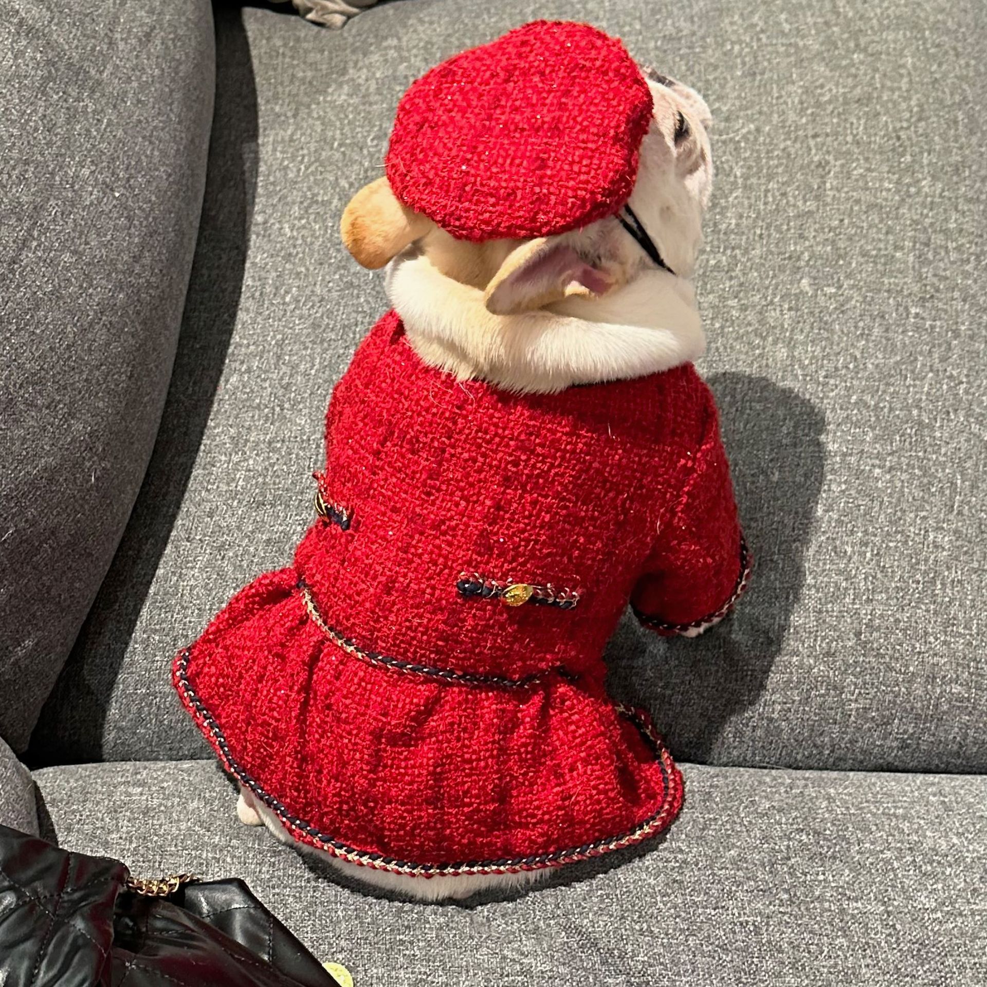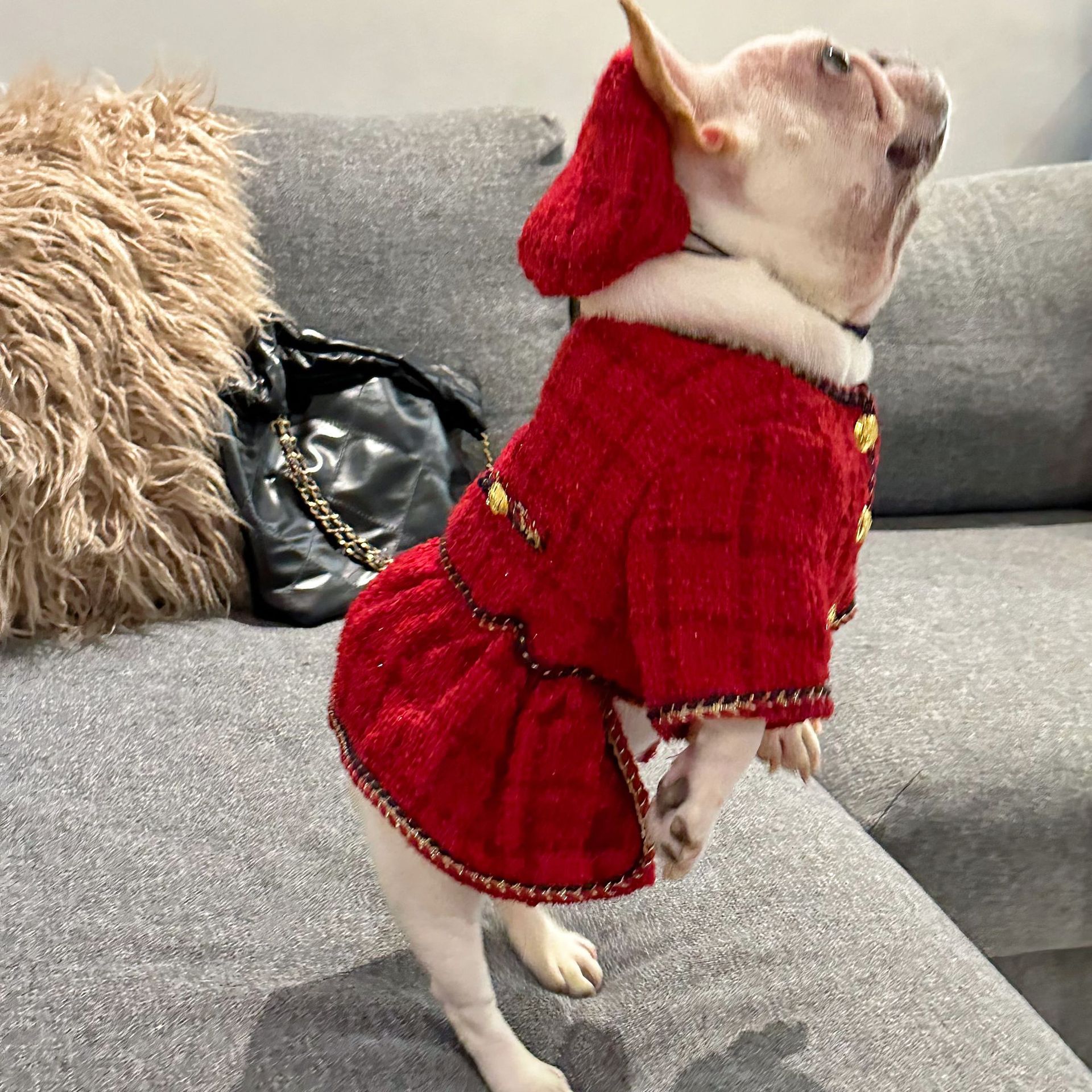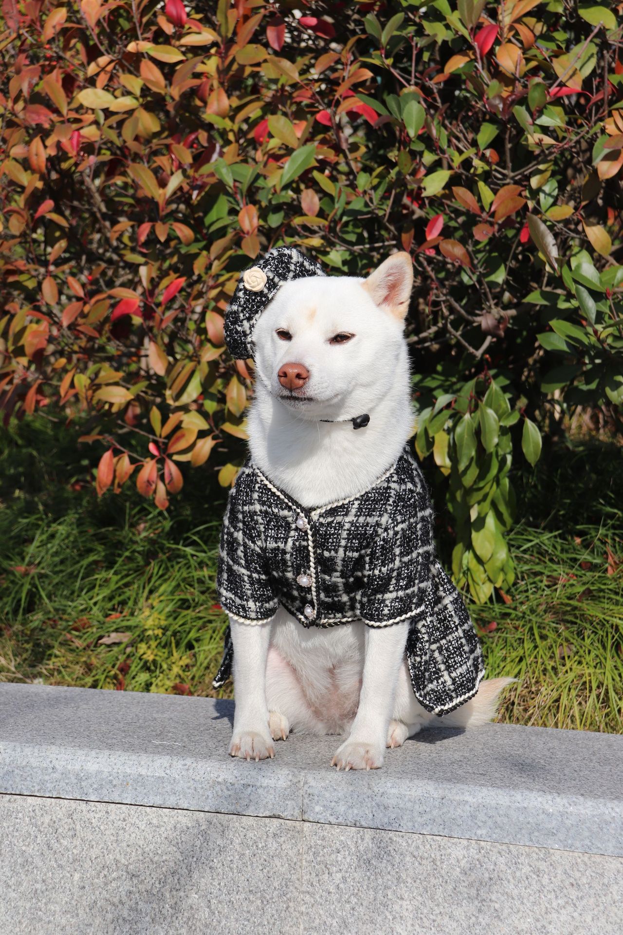 上品なツイード調生地で仕立てた、特別な日にぴったりの犬服です。