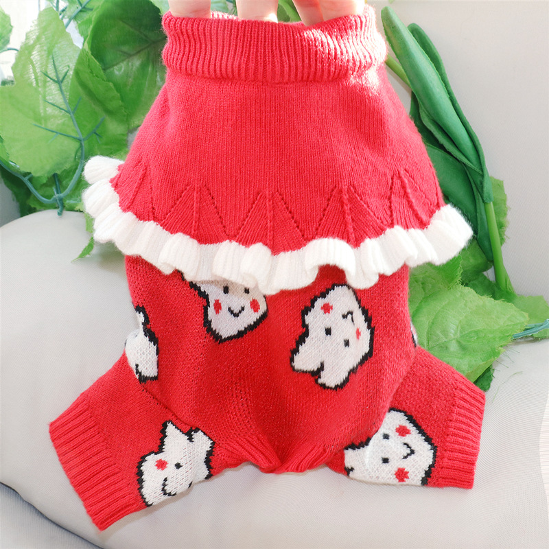 柔らかなニット素材で編まれたつなぎは、愛犬の体を優しく包み込み、寒い日のお散歩も快適に過ごせます。