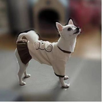 小型犬の愛らしさを引き立てる癒し系のデザインで、お出かけが楽しくなる一着です。