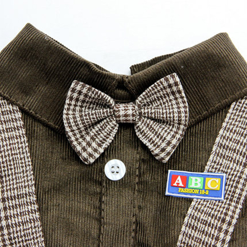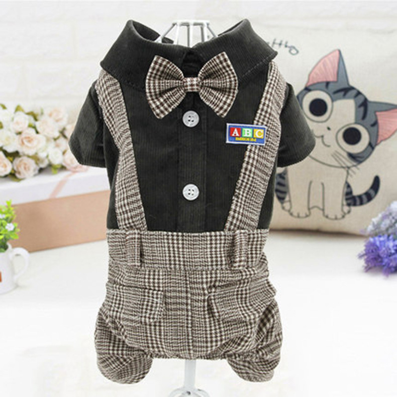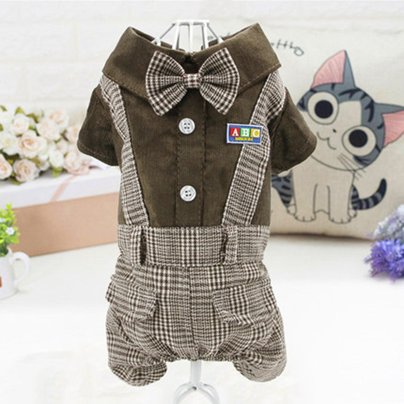 愛犬をおしゃれな紳士に変身させる、つなぎタイプの犬服です。