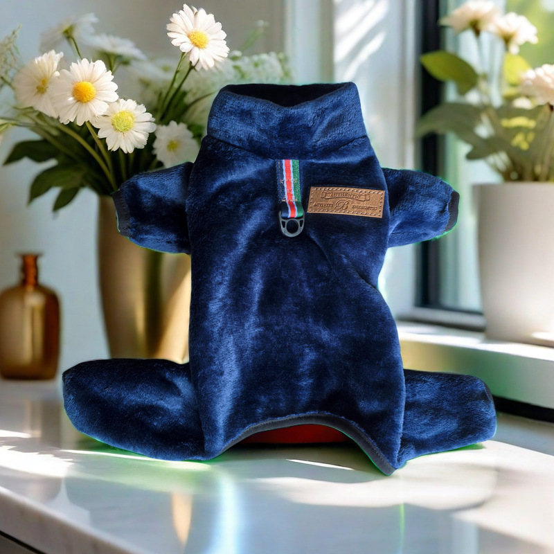 柔らかなベロア調の生地で仕立てた、愛犬を優しく包み込む犬服です。